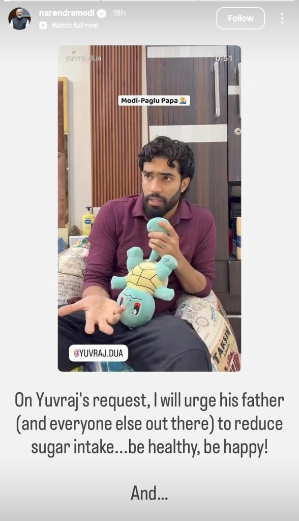 ନୂଆଦିଲ୍ଲୀ,୨୧|୩: ଦିଲ୍ଲୀର କଣ୍ଟେଣ୍ଟ କ୍ରିଏଟର ଯୁବରାଜ ନିଜ ବାପାଙ୍କ ଅଧିକ ମିଠା ଖାଇବା ଅଭ୍ୟାସ କମେଇବା ପାଇଁ ଏକ ମଜାଳିଆ ଭିଡିଓରେ ପ୍ରଧାନମନ୍ତ୍ରୀ ନରେନ୍ଦ୍ର ମୋଦୀଙ୍କୁ ଅନୁରୋଧ କରିଥିଲେ । ସେ ଭାବି ନ ଥିଲେ ଯେ, ଏହି ଛୋଟ ଅନୁରୋଧ ସିଧାସଳଖ ପ୍ରଧାନମନ୍ତ୍ରୀଙ୍କ ନିକଟକୁ ପହଞ୍ଚିବ । କିନ୍ତୁ ସେହି ଭିଡିଓକୁ ମୋଦୀ ନିଜେ ଶେୟର କରି, କେବଳ ଯୁବରାଜଙ୍କ ବାପାଙ୍କୁ ନୁହେଁ, ଜନସାଧାରଣଙ୍କୁ ସୁଗାର କମ ମାତ୍ରାରେ ଗ୍ରହଣ କରିବା କିମ୍ବା ମାତ୍ରା କମେଇବାକୁ ଅନୁରୋଧ କରିଛନ୍ତି । ତା’ ସହିତ ସ୍ୱାସ୍ଥ୍ୟ, ଫିଟନେସ୍ ଓ ଯୋଗର ଗୁରୁତ୍ୱ ଉପରେ ମଧ୍ୟ ଜୋର ଦେଇ ଇନଷ୍ଟାଗ୍ରାମରେ ଷ୍ଟୋରୀ ମଧ୍ୟ ସେୟାର କରିଛନ୍ତି ।