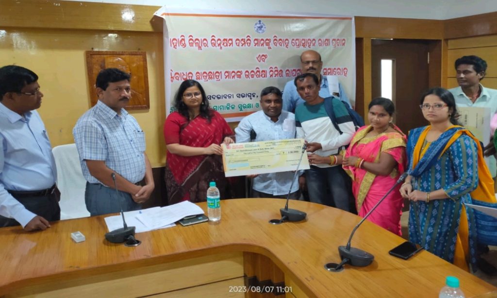 କଳାହାଣ୍ଡି ଜିଲ୍ଲା କର୍ଲାମୁଣ୍ଡା ବ୍ଳକ ର ବିଭିନ୍ନ ଗାଁ ର ଆଠ ଟି ଦିବ୍ୟଙ୍ଗ ପରିବାର କୁ ଦିବ୍ୟଙ୍ଗ ଙ୍କ ବିବାହ ପ୍ରୋତ୍ସାହନ ସହାୟତା ରାଶି ମିଳିଥିବା ଜଣା ପଡ଼ିଛି।ସୂଚନା ମତେ ସୋମବାର ଜିଲାପାଳ ଙ୍କ ସମ୍ମିଳନୀ କକ୍ଷରେ ଜିଲ୍ଲାପାଳ ପି. ଅନ୍ୱେସା ରେଡି, କର୍ଲାମୁଣ୍ଡା ଖ ଯୋନ ଜିଲ୍ଲା ପରିଷଦ ସଭ୍ୟ ତଥା କଳାହାଣ୍ଡି ଦିବ୍ୟଙ୍ଗ ମଞ୍ଚ ସଭାପତି ସୁରେଶ ଚୌଧୁରୀଙ୍କ ଉପସ୍ଥିତ ରେ ଏହି ବ୍ଳକ ର ଗଜବାହାଲ ଗାଁର ଦିବ୍ୟଙ୍ଗ ପରିବାର ଦିଗ ନାଗ ଓ ପତ୍ନୀ ସବିତା ନାଗ, ଭଟାପଲା ଗାଁ ର ଫାଲଗୁନ ସାହୁ ଓ ପତ୍ନୀ ଯଶୋବନ୍ତି ସାହୁ,ବ୍ରହ୍ମଣୀମୁଣ୍ଡା ଗାଁ ର କୈଳାସ ରଣା ଓ ପତ୍ନୀ ଅନିତା ରଣା, ତେରେସିଙ୍ଗା ଗ୍ରାମର ଅଞ୍ଜଳି ମାଝୀ ଓ ତାଙ୍କ ସ୍ବାମୀ ପବିତ୍ର ମାଝୀ, ବୋରପଦର ଗ୍ରାମ ର ବଳରାମ ସାହୁ ଓ ତାଙ୍କ ପତ୍ନୀ ସୁନାଫୁଲ ସାହୁ,ଜୋରାଡବରା ଗ୍ରାମର ନର୍ମଦା ବେହେରା ଓ ତାଙ୍କ ସ୍ବାମୀ ବଳଦେବ ଗଉଡ଼, ସ. ମାଲପଡା ଗ୍ରାମର ତପନ ଚନ୍ଦନ ଓ ତାଙ୍କ ପତ୍ନୀ ଜାନକୀ ହେର୍ନା, ସିଲେଟପଡା ଗ୍ରାମର ଶଶୀଭୂଷଣ ଜାନୀ ଓ ତାଙ୍କ ପତ୍ନୀ ସୀମା ଜାନୀ ପ୍ରମୁଖ ଙ୍କୁ ସରକାର ଙ୍କସାମାଜିକ ସୁରକ୍ଷା ଓ ଭିନ୍ନକ୍ଷମ ସଶକ୍ତିକରଣ ବିଭାଗ ପକ୍ଷରୁ ଦୁଇ ଲକ୍ଷ ପଚାଷ ହଜାର ଟଙ୍କା ଲେଖାଏଁ ସହାୟତା ରାଶି ର ଚେକ ପ୍ରଦାନ କରାଯାଇଥିଲା।ଠିକ ସେହିପରି ଜୁନାଗଡ଼ ବ୍ଳକ ର ବୁଢ଼ୀପଦର ଗ୍ରାମର ଦିବ୍ୟଙ୍ଗ ପରିବାର ନୀଳକଣ୍ଠ ଲେଞ୍ଜିଆ ଓ ତାଙ୍କ ପତ୍ନୀ ସାବେତ୍ରୀ ଲେଞ୍ଜିଆ ଙ୍କୁ ମଧ୍ୟ ୨ ଲକ୍ଷ ୫୦ ହଜାର ଟଙ୍କା ର ଚେକ ଦିଆଯାଇଥିବା ବେଳେ ଦୁଇ ଜଣ ଦିବ୍ୟଙ୍ଗ ଛାତ୍ର ଙ୍କୁ ଲାପଟୋପ ପ୍ରଦାନ କରାଯାଇଥିଲା।ଏଥିରେ ଅନ୍ୟ ମାନଙ୍କ ମଧ୍ୟରେ ବିଏସଏସଓ ସସ୍ମିତା ହୋତା, ଜିଲ୍ଲା ଭିନ୍ନକ୍ଷମ ପୁନଃର୍ବାସ କେନ୍ଦ୍ର ଭବାନୀପାଟଣା ର ବାଦଲ ପଟନାଏକ,ନିବାସ ସାହୁ ପ୍ରମୁଖ ଉପସ୍ଥିତ ଥିଲେ।