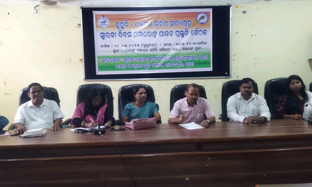 ପୁରୀ ୮/୫ ଅସ୍ତରଙ୍ଗ ବ୍ଲକ କୁହୁଡି ଠାରେ ପ୍ରତି ବର୍ଷ ମେ ୨୧ କୁ ଲବଣ ସତ୍ୟାଗ୍ରହ ସ୍ମୃତି ଦିବସ ଭାବେ ପାଳନ କରାଯାଏ।ଏହି ଉତ୍ସବ କୁ ଜିଲ୍ଲା ପ୍ରଶାସନ, ସୂଚନା ଓ ଲୋକ ସମ୍ପର୍କ ବିଭାଗ, ଉତ୍କଳ ସଂଗ୍ରାମୀ ସ୍ମୃତି ସମିତି ପକ୍ଷରୁ ଆୟୋଜନ କରାଯାଇଥାଏ।ଚଳିତ ବର୍ଷ ଏହି ଉତ୍ସବ କୁ ଶୃଙ୍ଖଳିତ ଓ ସୁଚାରୁ ରୁପେ ପରିଚାଳନା ପାଇଁ ଏକ ପ୍ରସ୍ତୁତି ବୈଠକ ଆଜି ଅସ୍ତରଙ୍ଗ ବ୍ଲକ ସମ୍ମିଳନୀ ଗୃହରେ ଅନୁଷ୍ଠିତ ହୋଇଥିଲା।ଏଥିରେ ଅଧ୍ୟକ୍ଷତା କରି ଅତିରିକ୍ତ ଜିଲ୍ଲାପାଳ ପ୍ରଶାସନ ଶରତ ଚନ୍ଦ୍ର ବେହେରା ଲବଣ ସତ୍ୟାଗ୍ରହ ର ସଂଗ୍ରାମୀ ମାନଙ୍କୁ ଉଚିତ ସମ୍ମାନ ଓ ଶ୍ରଦ୍ଧାଞ୍ଜଳି ଦେବାର ଏହା ଏକ ଶୁଭ ଅବସର।ଆମ ଆଗାମୀ ପିଢି ଏହି ସତ୍ୟାଗ୍ରହ ସମ୍ପର୍କରେ ଅବଗତ ହେବା, ସଂଗ୍ରାମୀ ମାନଙ୍କ ତ୍ୟାଗ, ସଂଘର୍ଷ ଓ ବଳିଦାନ ସମ୍ପର୍କରେ ଅବଗତ ହେବା ଆବଶ୍ୟକ ବୋଲି ସେ କହିବା ସହ ସମସ୍ତ ଙ୍କ ସହଯୋଗ ରେ କାର୍ଯ୍ୟକ୍ରମ କୁ ସଫଳ କରିବାକୁ ଆହ୍ବାନ ଦେଇଥିଲେ।ଯେଉଁ ବିଭାଗ କୁ ଯେଉଁ ଦାୟିତ୍ୱ ଦିଆ ଯାଉଛି ତାହାକୁ ନିର୍ଦ୍ଧାରିତ ସମୟରେ ସମାପନ ପାଇଁ ସେ ନିର୍ଦ୍ଦେଶ ଦେଇଥିଲେ।