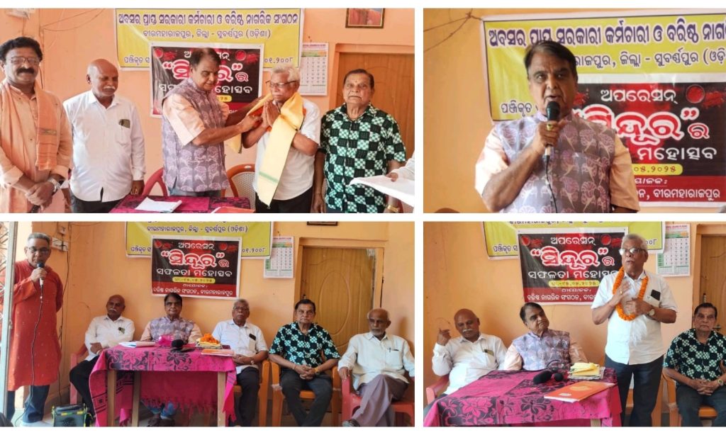 ସୁବର୍ଣ୍ଣପୁର ଜିଲ୍ଲା ବୀରମହାରାଜପୁର ସଦର ମହକୁମା ଠାରେ ଥିବା ଅବସର ପ୍ରାପ୍ତ ସରକାରୀ କର୍ମଚାରୀ ଓ ବରିଷ୍ଠ ନାଗରିକ ସଂଗଠନ କାର୍ଯ୍ୟାଳୟ ପରିସରରେ ଅପରେସନ୍ ସିନ୍ଦୂରର ସଫଳତା ମହୋତ୍ସବ ଆଜି ପାଳିତ ହୋଇ ଯାଇଛି । ଅନୁଷ୍ଠାନ ର ସଭାପତି ଡ. ପ୍ରଫୁଲ୍ଲ କୁମାର ରଥଙ୍କ ସଭାପତିତ୍ୱ ରେ ଆୟୋଜିତ କାର୍ଯ୍ଯକ୍ରମରେ ଅବସରପ୍ରାପ୍ତ ସେନା କର୍ମଚାରୀ ପ୍ରତାପ ପାଣିଗ୍ରାହୀ ମୁଖ୍ୟ ଅତିଥି ଭାବରେ ଯୋଗଦାନ କରି ୧୯୭୧ରେ ହୋଇଥିବା ଯୁଦ୍ଧରେ ନିଜର ଅନୁଭୂତି ବର୍ଣ୍ଣନା କରିଥିଲେ ଓ ତତ୍ ସଙ୍ଗେସଙ୍ଗେ ବର୍ତ୍ତମାନ ହୋଇଥିବା ଅପରେସନ ସିନ୍ଦୂରରେ ଭାରତୀୟ ସୈନିକ ମାନଙ୍କ ଅପୂର୍ବ ସଫଳତା ପାଇଁ ଭୁରି ଭୁରି ପ୍ରଶଂସା କରିଥିଲେ। ଭାରତୀୟ ସ୍ବଦେଶୀ କୌଶଳରେ ନିର୍ମିତ କ୍ଷେପଣାସ୍ତ୍ର ଅତୀବ ଉନ୍ନତ ମାନର ବୋଲି ମତବ୍ୟକ୍ତ କରିଥିଲେ। ସମ୍ମାନିତ ଅତିଥି ଭାବରେ ପୂର୍ବତନ ସଭାପତି ଭଗବାନ ମିଶ୍ର , ସଂପାଦକ ସନ୍ତୋଷ ଷଡ଼ଙ୍ଗୀ ମଞ୍ଚାସିନ ଥିଲେ । ଅନୁଷ୍ଠାନର କୋଷାଧ୍ୟକ୍ଷ ଦୟାନିଧି ହୋତା ସ୍ବାଗତ କରିଥିଲେ । ବରିଷ୍ଠ ସଦସ୍ୟ ତଥା ଶିକ୍ଷାବିତ ଭୂଷଣ କୁମାର ପାତ୍ର, ଜ୍ଞାନେନ୍ଦ୍ର ତ୍ରିପାଠୀ , ସୂର୍ଯ୍ୟ ନାରାୟଣ ପାଣିଗ୍ରାହୀ ପ୍ରମୁଖ ବକ୍ତବ୍ୟ ରଖିଥିଲେ। ପାକିସ୍ଥାନ ର ଆକ୍ରମଣ ରେ ପ୍ରାଣ ହରାଇଥିବା ଭାରତୀୟ ସୈନିକ ଓ ସାଧାରଣ ନାଗରିକ ମାନଙ୍କ ଅମର ଆତ୍ମାର ସଦ୍‌ଗତି ନିମନ୍ତେ ଦୁଇ ମିନିଟ ନୀରବ ପ୍ରାର୍ଥନା କରା ଯାଇଥିଲା । ବରିଷ୍ଠ ସଦସ୍ୟ ଡ. ଦ୍ବିତୀକୃଷ୍ଣ ପଣ୍ଡା କାର୍ଯ୍ୟକ୍ରମ ସଂଯୋଜନା କରିଥିବା ବେଳେ ଉପସଭାପତି ସୌମିତ୍ରି ମେହେର ଧନ୍ୟବାଦ ଅର୍ପଣ କରିଥିଲେ । ସମସ୍ତ କାର୍ଯ୍ୟ ରେ ଚମରା ମହାକୁର , ବଳରାମ କାଣ୍ଡ , ବାସୁଦେବ ପଣ୍ଡା , ନାରାୟଣ ପ୍ରସାଦ ନାୟକ , ଅକ୍ଷୟ ମିଶ୍ର , ଦିଲ୍ଲିପ ମିଶ୍ର , ଅକ୍ରୂର ଦନ୍ତା , ଗୋପୀନାଥ ମହାକୁର , ରାଧେଶ୍ୟାମ ରାଏ, ଜୟଦେବ ସାହୁ ପ୍ରମୁଖ ସହଯୋଗ କରିଥିଲେ।