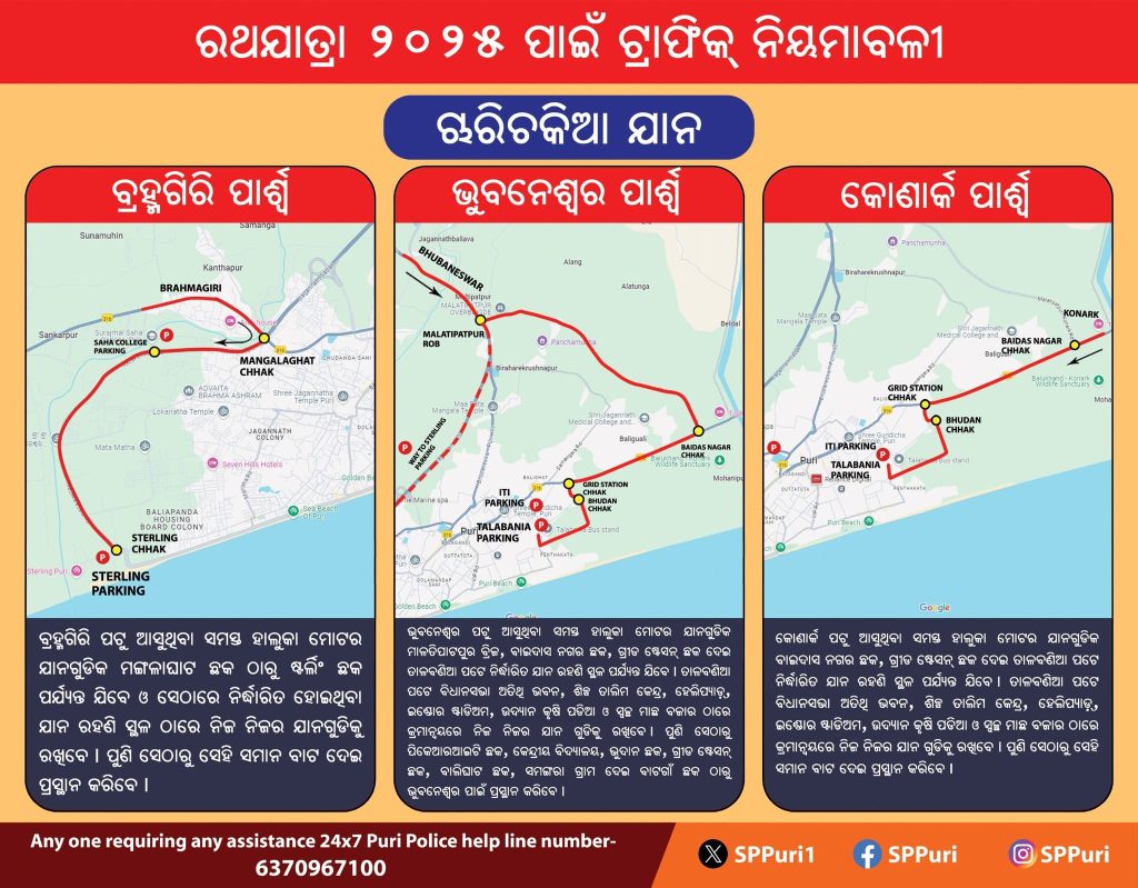 ପୁରୀ: ବିଶ୍ଵପ୍ରସିଦ୍ଧ ରଥଯାତ୍ରା-୨୦୨୫ ପାଇଁ ପୁରୀ ପୋଲିସ୍ ପକ୍ଷରୁ ଟ୍ରାଫିକ୍ ନିୟମାବଳୀ ଜାରି କରାଯାଇଛି। ତେବେ ଜାଣନ୍ତୁ କେଉଁ ରାସ୍ତା ଦେଇ ଗମନାଗମନ କରିବେ।