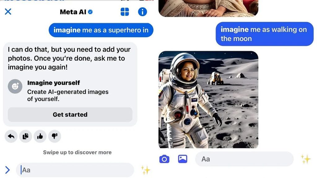 ଏହି ଫିଚର ପାଇଁ ମେଟା ଏଆଇ ବିଭିନ୍ନ କୋଣରୁ ଆପଣଙ୍କ ମୁହଁର କିଛି ଫଟୋ ନେବାକୁ ଅନୁରୋଧ କରିବ ଯାହା ଦ୍ୱାରା ଏହା ଆପଣଙ୍କ ମୁହଁର ଫିଚରଗୁଡ଼ିକୁ ସଠିକ୍ ଭାବରେ ବିଶ୍ଳେଷଣ କରିପାରିବ। ଏହା ପରେ ଯେତେବେଳେ ଆପଣ ଏକ ପ୍ରମ୍ପ୍ଟ ଦେବେ ଯେଉଁଥିରେ ‘ଇମାଜିନ୍ ମି’ ଲେଖାଯାଇଛି, ସେତେବେଳେ ଏଆଇ ସେହି ସ୍ଥାନ କିମ୍ବା ପରିସ୍ଥିତି ଅନୁସାରେ ଆପଣଙ୍କର ଏକ ଫଟୋ ତିଆରି କରିବ। ଏହି ଫଟୋଗୁଡ଼ିକ ସମ୍ପୂର୍ଣ୍ଣ ଭାବରେ ଏଆଇ ବ୍ୟବହାର କରି ତିଆରି କରାଯାଇଛି ଏବଂ ଏଥିରେ ଟିକେ କୃତ୍ରିମ ପ୍ରଭାବ ଅଛି ଯାହା ଦ୍ୱାରା କେହି ସେଗୁଡ଼ିକୁ ପ୍ରକୃତ ଫଟୋ ବୋଲି ଭାବିବେ ନାହିଁ।