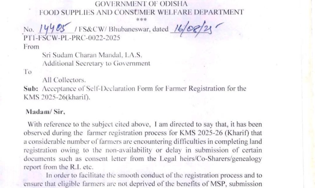 ବିଭାଗିୟ ପତ୍ର ସଂଖ୍ୟା – ୧୪୪୦୫/ତା.୧୬/୦୮/୨୦୨୫ ମାଧ୍ୟମ ରେ ଚାଷୀ ପଞ୍ଜିକରଣ କୁ ସରଳ ଓ ସହଜ କରିବା ପାଇଁ ନିର୍ଦ୍ଦେଶ ଦିଆଯାଇଛି । ଏଥିରେ ପଞ୍ଜିକରଣ ସମୟରେ ବଂଶାବଳୀ ଓ ଆଇନଗତ ଉତ୍ତରାଧିକାରୀ କୁ ସ୍ଵ-ଘୋଷିତ (ସେଲ୍ଫ ଡିକ୍ଲାରେଶନ) ଜରିଆରେ ଗ୍ରହଣ କରିବା ପାଇଁ ନିର୍ଦ୍ଦେଶ ଦିଆଯାଇଛି । ଏହା ସହିତ ବିଭାଗୀୟ ପତ୍ର ସଂଖ୍ୟା – ୧୪୩୧୭/ତା.୧୬/୦୮/୨୦୨୫ ଜରିଆରେ ଚାଷୀ ପଞ୍ଜିକରଣ ତାରିଖ କୁ ୨୦ ଅଗଷ୍ଟ ରୁ ୨୫ ଅଗଷ୍ଟ ଓ ଡିଜିଟାଲାଇଯେସନ ଅଫ ସୋସାଇଟି ର ତାରିଖ କୁ ୨୫ ଅଗଷ୍ଟ ରୁ ୩୦ ଅଗଷ୍ଟ ଯାଏଁ ବୃଦ୍ଧି କରିବା ପାଇଁ ନିର୍ଦ୍ଦେଶ ଦିଆଯାଇଛି ।