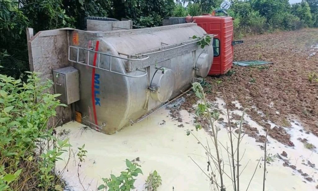 କ୍ଷୀର ବୋଝେଇ ଟ୍ୟାଙ୍କର ଦୁର୍ଘଟଣା ଘଟି ଲକ୍ଷାଧିକ ଟଙ୍କା ମୂଲ୍ଯର କ୍ଷୀର ନଷ୍ଟ୍